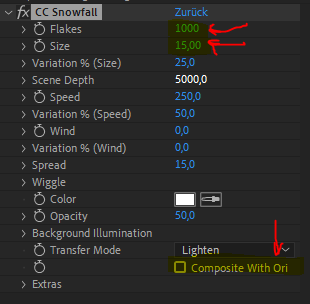 Um den Schnee darzustellen, suchen wir unter den Effekten nach „Snow“ und wählen den ersten Effekt aus. In den Einstellungen setzen wir „Flakes“ auf 1000, „Size“ auf 15 und „Composite With Original“ auf „Aus“.