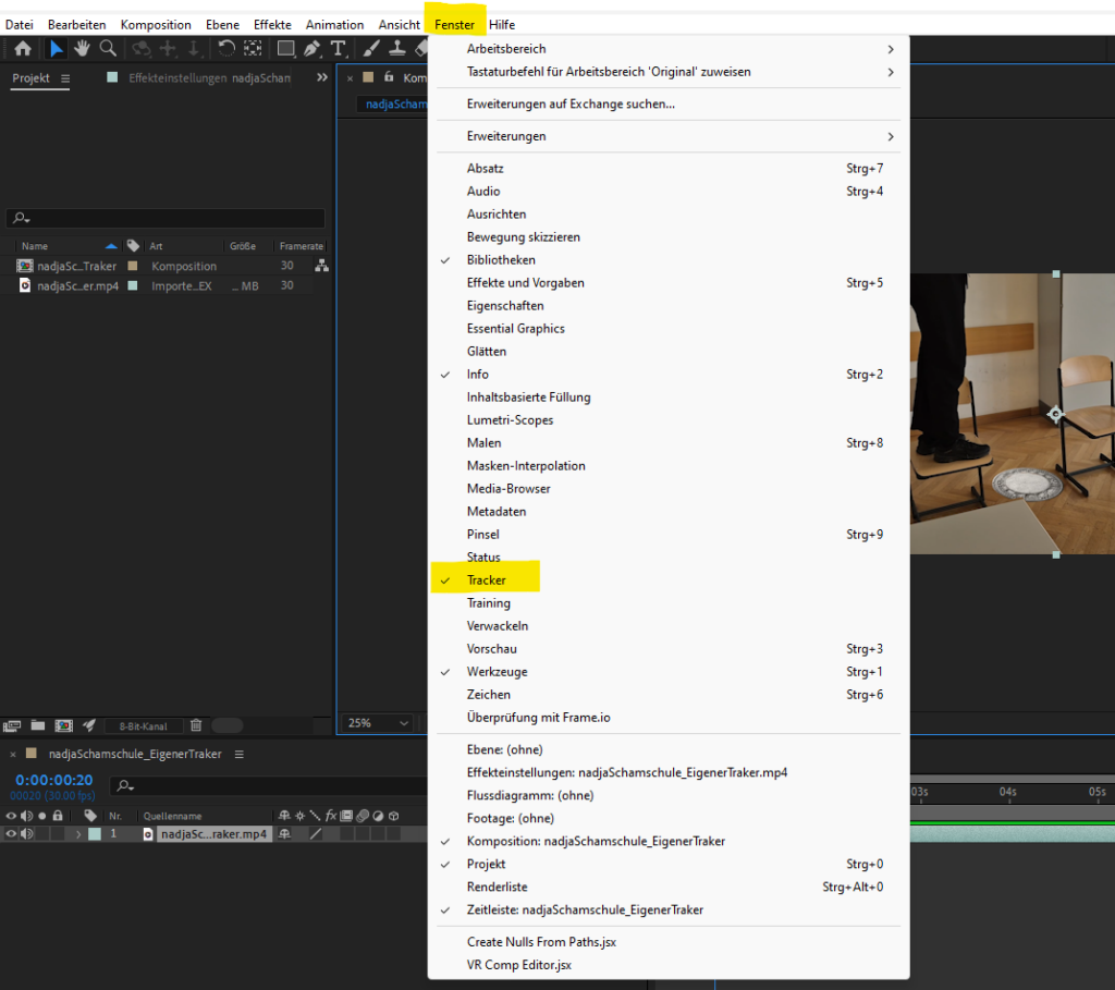 Nachdem das Video eingefügt wurde, kannst du mit dem Setzen der Tracker-Punkte beginnen. Dafür gehst du im oberen Menü auf „Fenster“ und wählst „Tracker“ aus. Nun erscheint ein Bereich auf der rechten Seite.