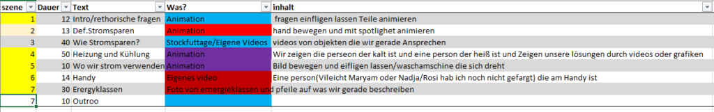 Nachdem wir also ein Thema hatten, war es Zeit, Ideen zu sammeln. Dafür haben wir uns in zwei Gruppen aufgeteilt. Maryam und ich haben uns eher auf das Visuelle konzentriert. Wir haben überlegt, wo wir Animationen einsetzen können, wo wir Stockfootage benötigen und wo wir selbst filmen können. In dieser Phase ist unter anderem dieser Szenenplan entstanden.